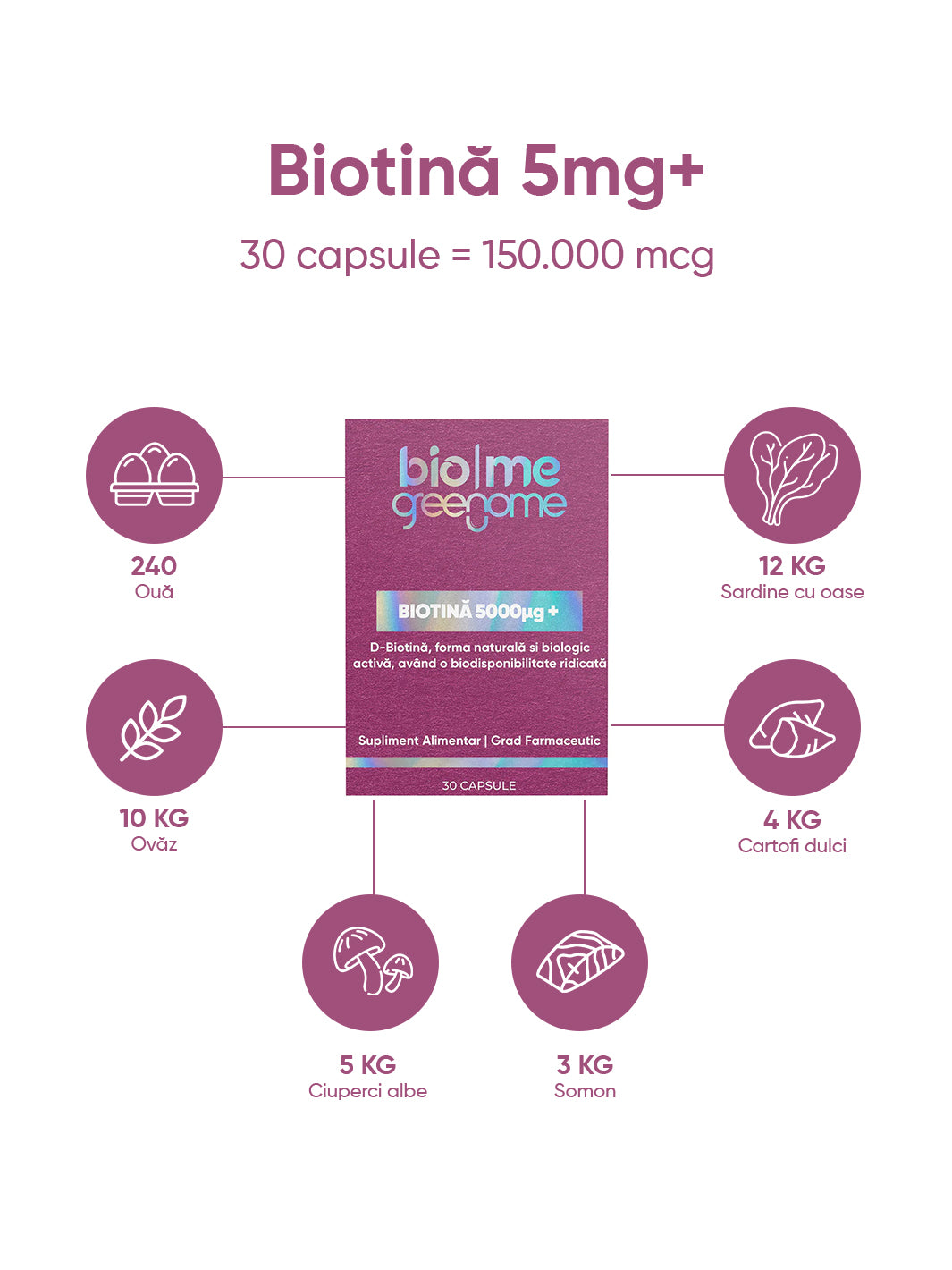 💁♀️ Biotină premium, în forma naturală D-biotină, ușor de integrat în rutina zilnică. Creată în România, cu ingrediente atent analizate.